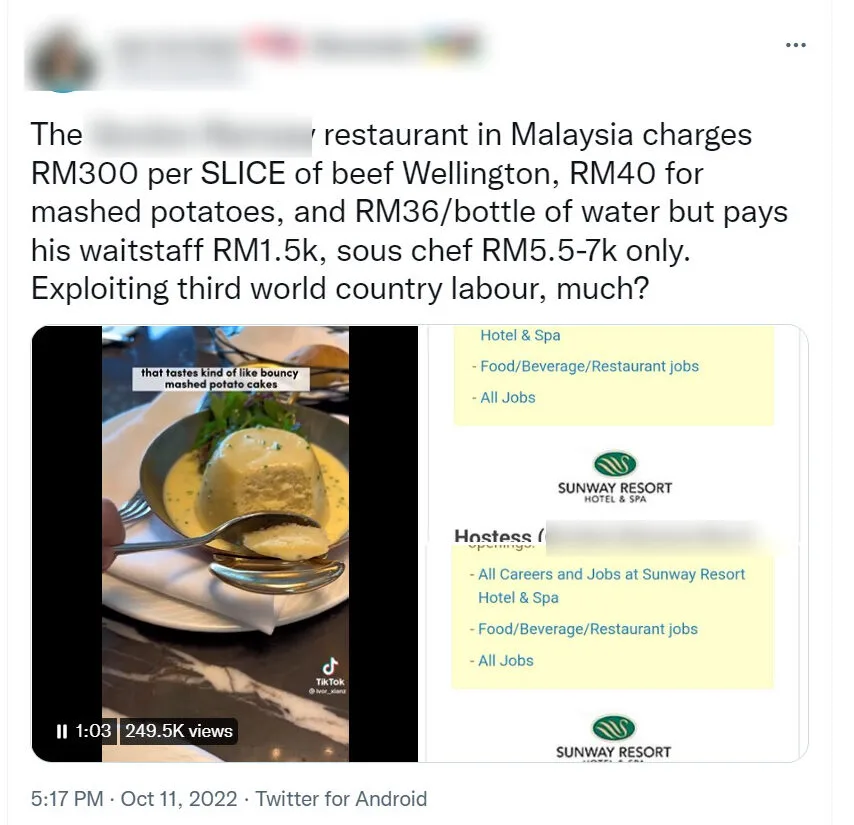 It’s understood that Ivor and her friends paid over RM 250 each for their orders. “The (restaurant’s name) in Malaysia charges RM300 per slice of beef Wellington, RM40 for mashed potatoes, and RM36 per bottle of water, but they only pay their waitstaff RM1.5k, while their sous chef earns RM5.5 to 7k only. Exploiting third world country labour, much?” the Twitter user questioned, expressing her concern towards all the staffs who are allegedly underpaid.