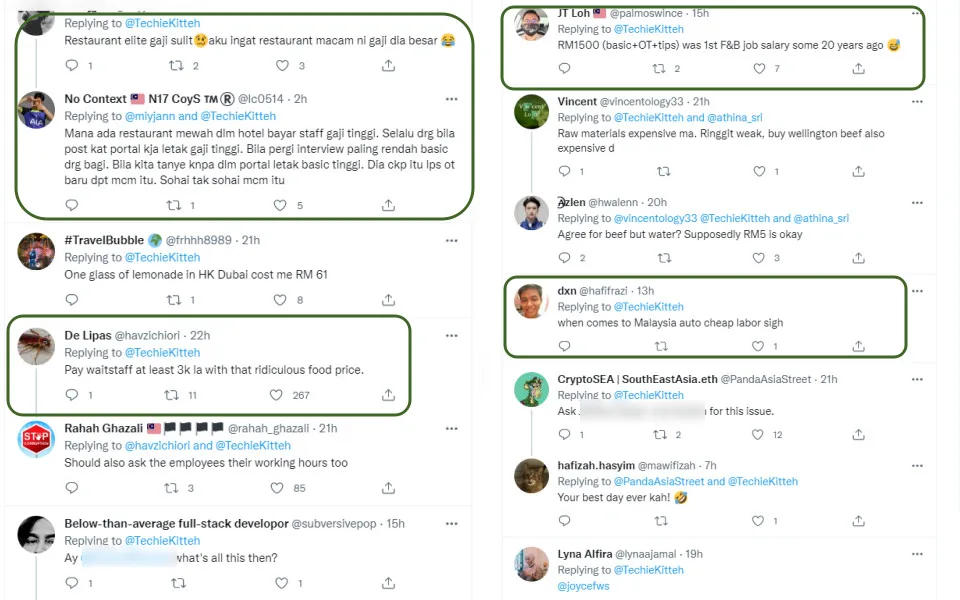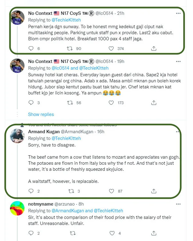 The post has been flooded with numerous responses from netizens. According to a Twitter user, “I’ve worked at a hotel under Sunway previously. To tell you the truth, the salary there is too low even for those who multitask. They didn’t even provide parking for the staff. In the end, I decided to pull out (of the job). Not to mention the politics.” Others also wrote, “They should pay their waitstaff at least RM3k with that ridiculous food price.”