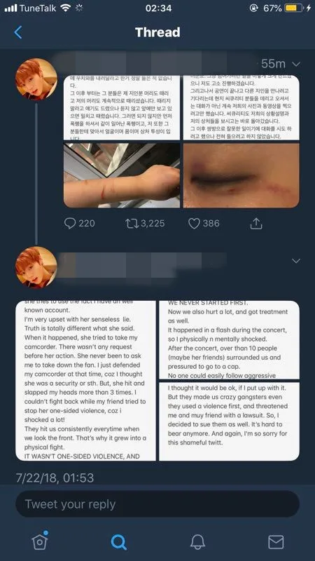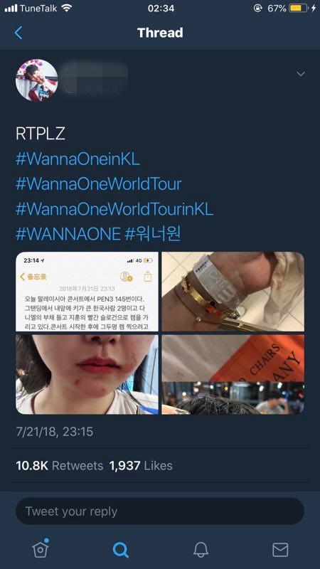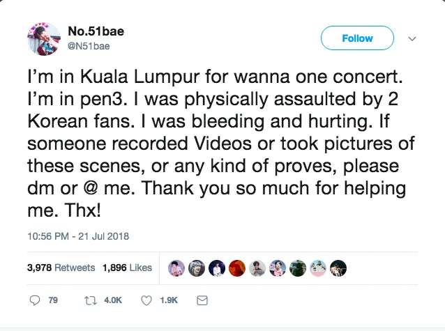 The injured fan, who took to Twitter to share her account, wrote, “I (was) in Kuala Lumpur for Wanna One concert. I’m (was) Pen3. I was physically assaulted by 2 Korean fans. I was bleeding and hurting. If someone recorded videos or took pictures of these scenes, or any kind of (proofs), please dm or @ me. Thank you so much for helping me.”
