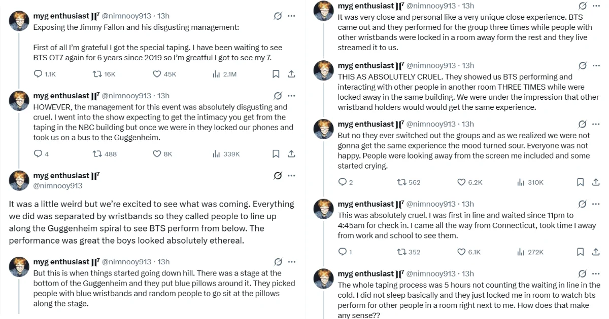 BTS’s (방탄소년단) comeback activities are in full force, with the K-pop sensations recently appearing on “The Tonight Show Starring Jimmy Fallon”. Unfortunately, fans who attended the taping said the event was a horrifying experience.