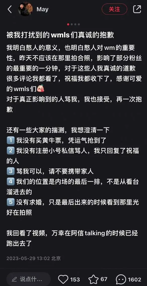 A day after the concert, the woman posted an apology message expressing her regret for interrupting the concert with her wedding photo session. In the post, she also clarified some of the guesses netizens had made.