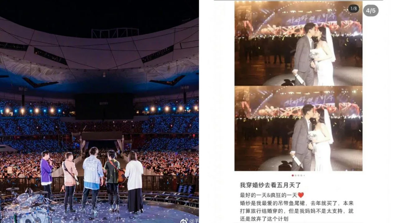 For the past week, Taiwanese group Mayday (五月天), had been holding six consecutive concerts in Beijing’s national stadium. However, no one expected to see a couple dressed in their wedding attire with the intention to snap wedding photos at the rock concert. The incident on 28th May soon went viral online.