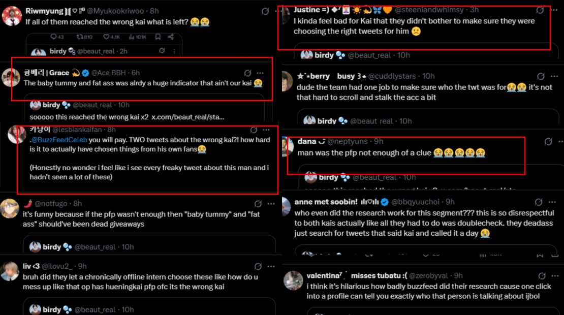 If the tweets themselves weren’t obvious enough, the profile photos of those accounts should have been the biggest giveaway, as they featured pictures of Hueningkai, clearly indicating which fandom the users belong to. These moments in the video quickly went viral, with fans calling out BuzzFeed for not doing their research properly. Others accused the publication of being lazy and failing to double-check that the tweets were actually directed at, or referring to, the guest on the show.
