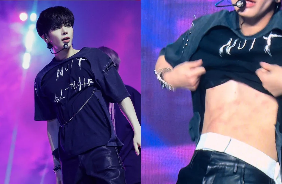 Apart from the exhaustion and minor bruises over the past few weeks, fans pointed out something highly concerning about Taehyun (태현)’s body. At TXT’s most recent show in Los Angeles earlier this week, fans noticed red rashes on the singer’s stomach when he lifted up his shirt during a performance.