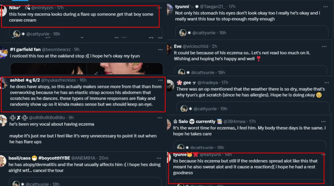 As seen in the photo above, the rashes were very visible when the idol appeared on screen. This obviously caused concern among MOAs (TXT fans) about his health condition. Many speculated that the red marks were due to his eczema flaring up.