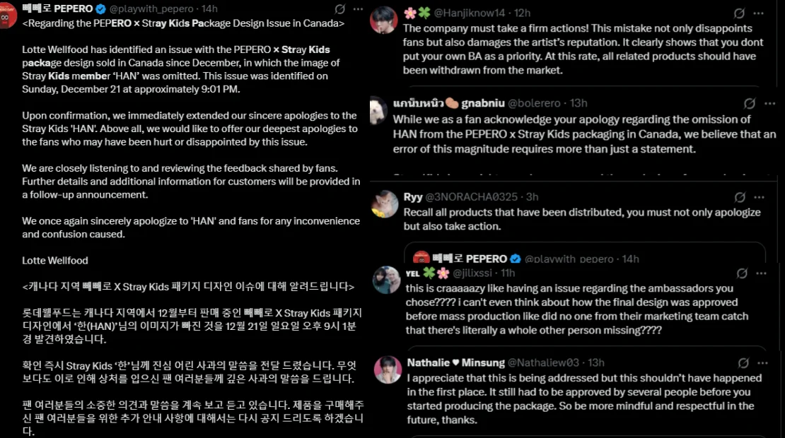 Many accused Lotte and PEPERO of disrespecting Han by excluding him from the packaging. Others have called for a boycott until the company acknowledges the mistake and recalls the products to correct the error. Some even tagged Stray Kids themselves to make them aware of the situation, although it is highly unlikely the group would publicly comment on it.