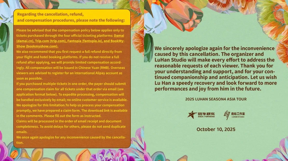 On Sunday (12th October), the official Season 4 and Luhan Studio Instagram pages issued a joint statement once again apologising to fans for the cancellation of Luhan’s concert due to the artist’s health. The agency announced that full refunds would be issued to everyone who purchased concert tickets via the official ticketing partners, but that’s not all.