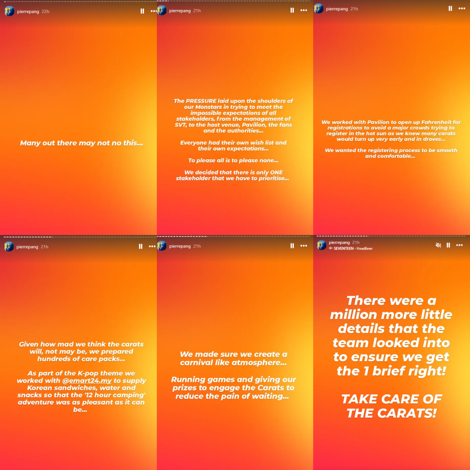 First, let’s start off with what the CEO of MAMEE-Double Decker Group, Mr Pierre Pang, had to say. He shared his thoughts on the special occasion, expressing his heartfelt gratitude not only to his team but also to CARATS (SEVENTEEN fans) for making the Mister Potato x SEVENTEEN Jinjja Crunch Fan Meeting a huge success. Mr Pang revealed that the team had learned from both their own and other organisers’ past mistakes, ensuring that this time CARATS were prioritised throughout the entire event.
