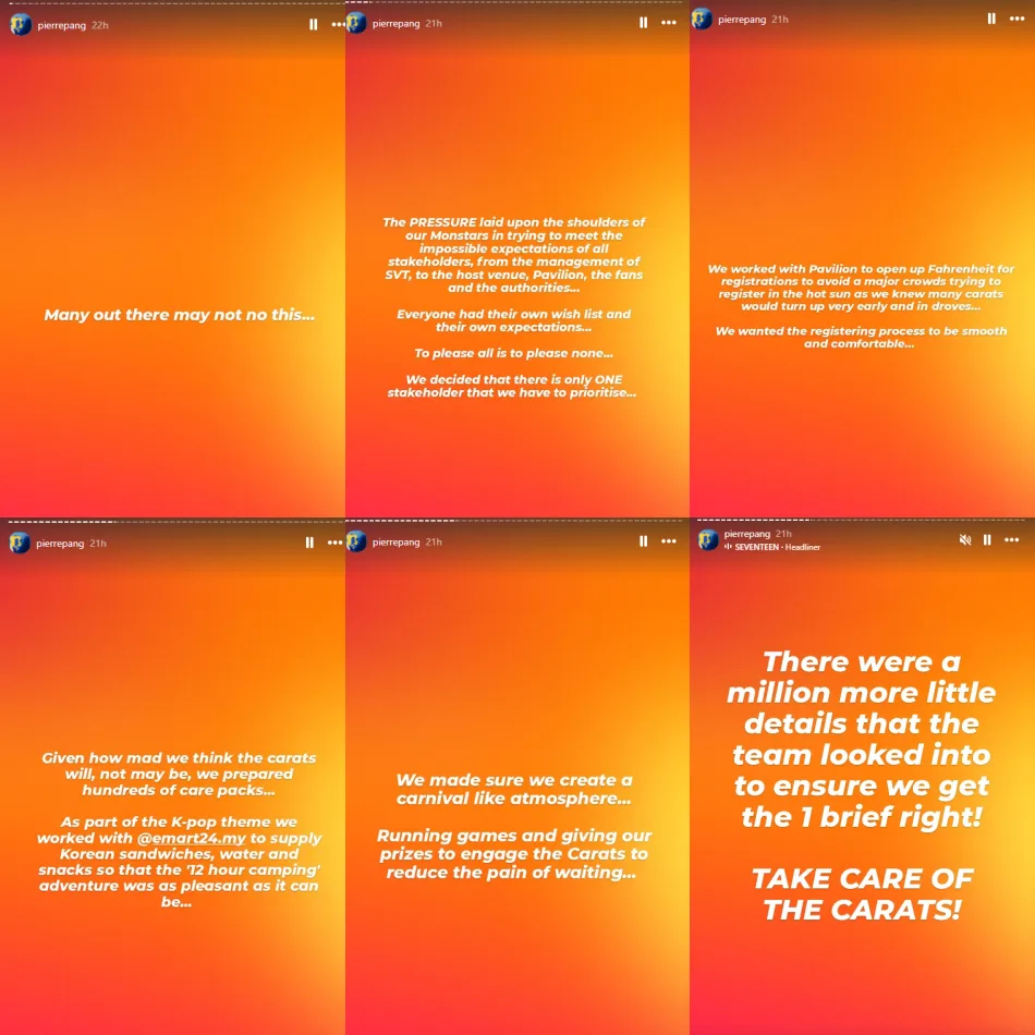 First, let’s start off with what the CEO of MAMEE-Double Decker Group, Mr Pierre Pang, had to say. He shared his thoughts on the special occasion, expressing his heartfelt gratitude not only to his team but also to CARATS (SEVENTEEN fans) for making the Mister Potato x SEVENTEEN Jinjja Crunch Fan Meeting a huge success. Mr Pang revealed that the team had learned from both their own and other organisers’ past mistakes, ensuring that this time CARATS were prioritised throughout the entire event.