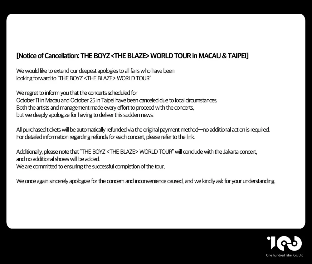 Yesterday (Thursday, 25th September), THE BOYZ’s agency, 100 Label, released an official statement informing fans that their scheduled concerts in Macau (11th October) and Taipei (25th October) had been cancelled due to “local circumstances”. “We deeply apologise for having to deliver this news,” the statement read. The tour will now conclude in Jakarta, Indonesia, on 8th November, with no further shows to be added.