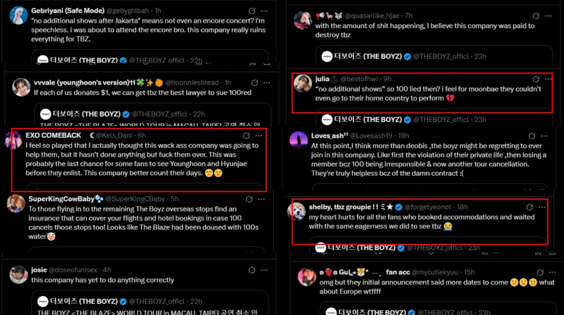 The news has since sparked outrage among fans, who were shocked by both the sudden cancellations and the early conclusion of the world tour. Many expressed disappointment, noting that the initial announcements had promised more dates would be added. Others criticised the agency, accusing it of deliberately sabotaging THE BOYZ by cancelling shows and making last-minute venue changes during the US leg of the tour.