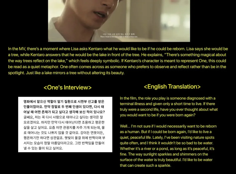 Speaking of lakes, during a 2019 interview to promote “Goodbye Summer”, the series he starred in that year, ONE said he would like to be reborn as a body of water (a river or lake), emphasising the peaceful environment and the way sunlight sparkles on the surface. His character in the series was also suffering from a terminal illness. Fans noted how oddly specific this detail is in Lisa’s “DREAM” film, in which Kentaro Sakaguchi gives a similar answer before passing away.