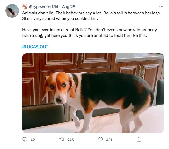 One netizen also came up with a post about Lucas’ pet dog, Bella. They tweeted, “Animals don’t lie. Their behaviour says a lot. Bella’s tail is between her legs. She’s very scared every time you scold her. Have you ever taken care of Bella? You don’t even know how to properly train a dog, yet here you think you are entitled to treat her like this.”