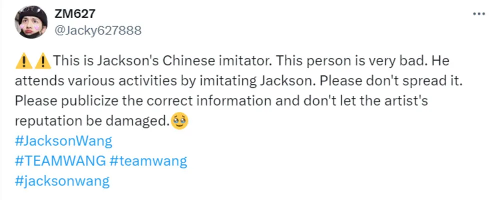 ⚠️⚠️This is Jackson's Chinese imitator. This person is very bad. He attends various activities by imitating Jackson. Please don't spread it. Please publicize the correct information and don't let the artist's reputation be damaged.🥹#JacksonWang#TEAMWANG #teamwang#jacksonwang pic.twitter.com/j6HAkw1XWA