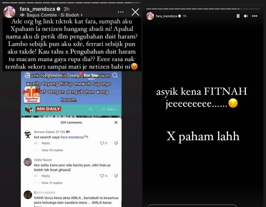 Fara quickly took to her IG Story yesterday (Wednesday, 25th October) to address the speculations. In the screenshot shown, she said, “I really don’t understand here. Why is my name being mentioned in the money laundering case? I don’t even own luxury cars! Do you know what money laundering actually looks like? I swear, I feel like shooting these netizens who are spreading this false information”.