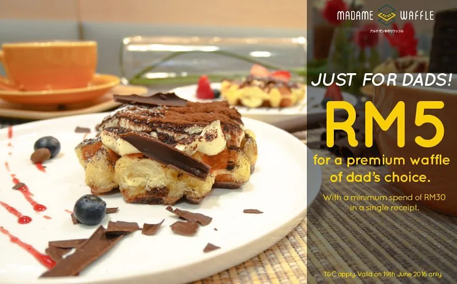 Madame Waffle is offering you the chance to treat your Dad to their premium waffles for RM5, and all you have to do is just spend at least RM30 in a single receipt. Choose between the Tiramisu Waffle, Musang Durian Creme Brûlée, Snowy Matcha Mochi, Sea Salt Dark Chocolate Chunk, Blueberry Cream Cheese, or White Chocolate Lychee flavour, but bear in mind that the promotion is only available on Sunday (19th June).