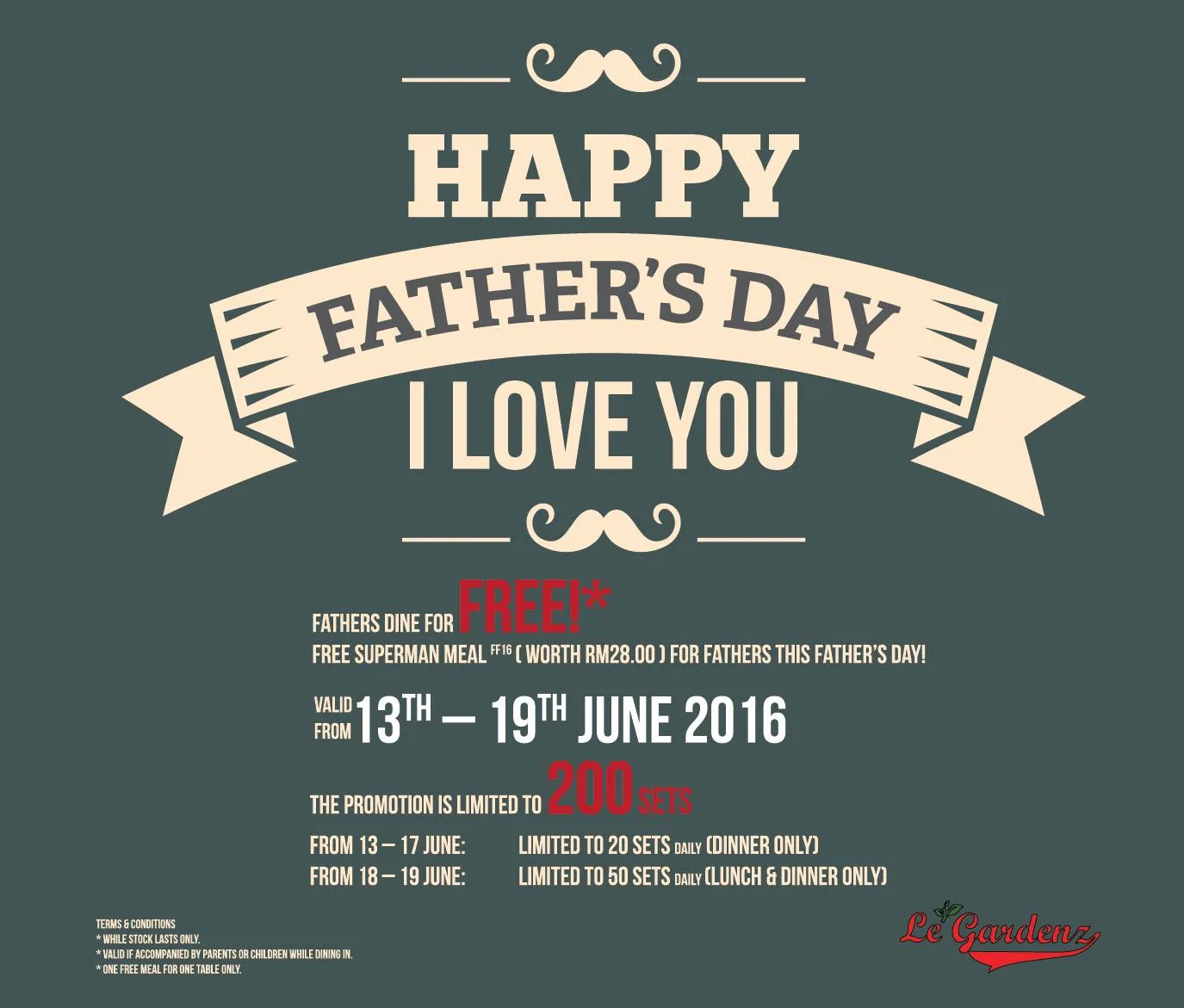 No worries, Le’ Gardenz Cafe is giving away free “Superman Meals” for fathers this whole week (13th – 19th June)! For sons and daughters, just step in with your Dad; for fathers, just step in with your little ones!