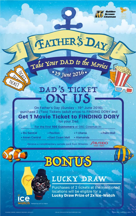 GSC Cinemas is offering you the chance to treat your Dad to watch the highly anticipated “Finding Dory”, and it’s for free! All you have to do is purchase 2 tickets (bring your Mom along!) for the animated film on Father’s Day (19th June) and you are entitled to 1 complimentary ticket for your Dad.