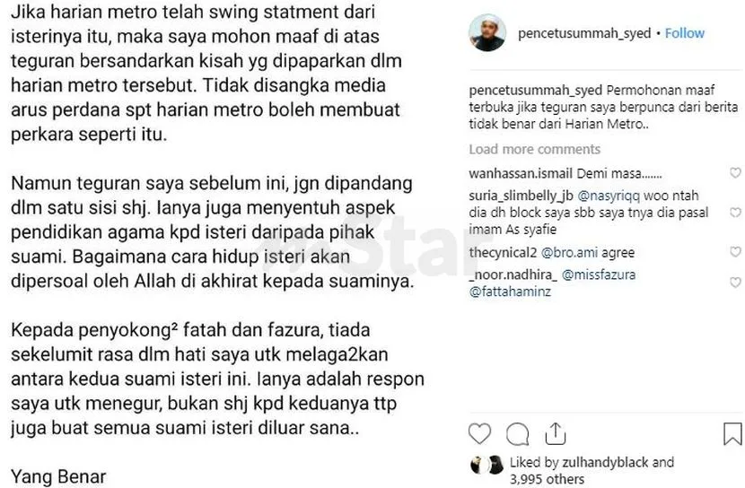 The ustaz known as Pencetus Ummah Syed has released an apology statement to the couple saying that he only made the statement based on what has been reported by the local daily. The statement has also been deleted from the ustaz’s account.