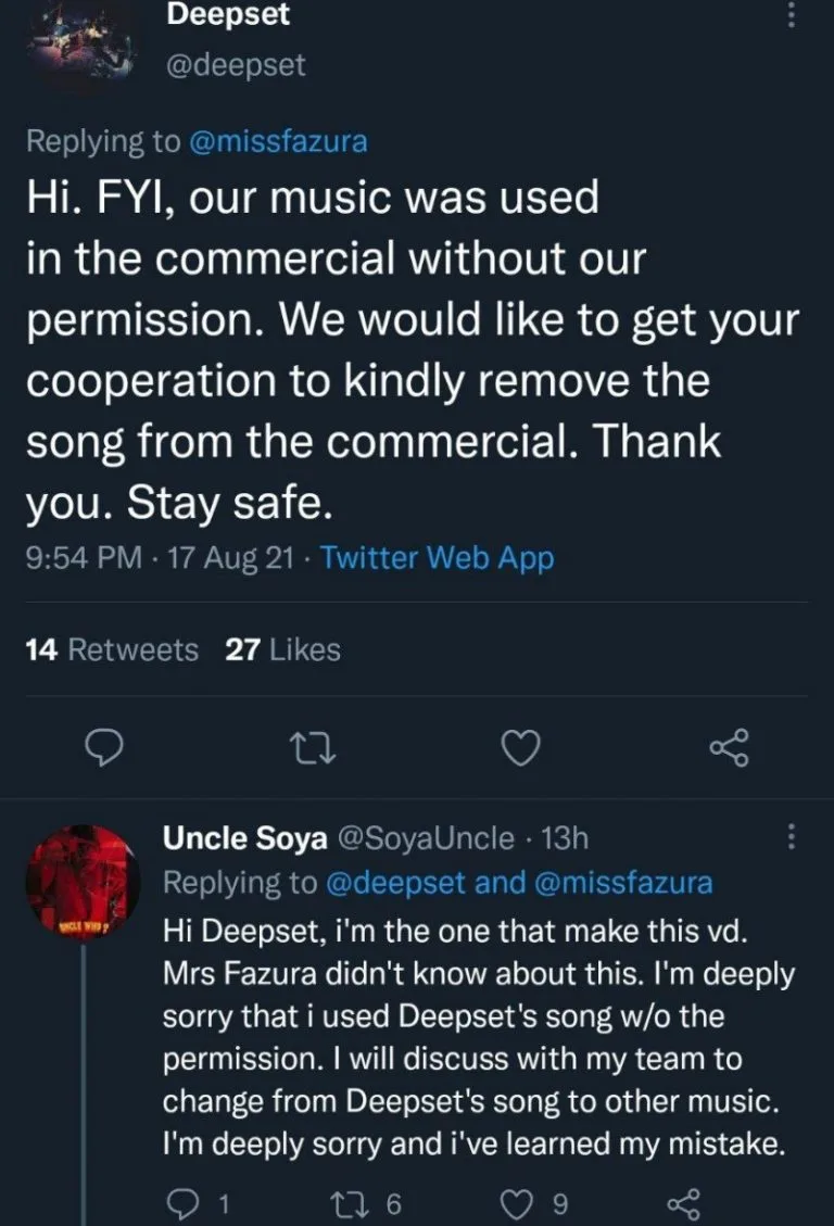 Soon after, the individual responsible for the commercial video quickly came forth to clear the air on the issue. The user, @UncleSoya, explained, “Mrs. Fazura didn’t know about this. I’m deeply sorry for using your song without permission. I will discuss with my team to change the background music.” For those wondering, the commercial clip is no longer available on all social media platforms.