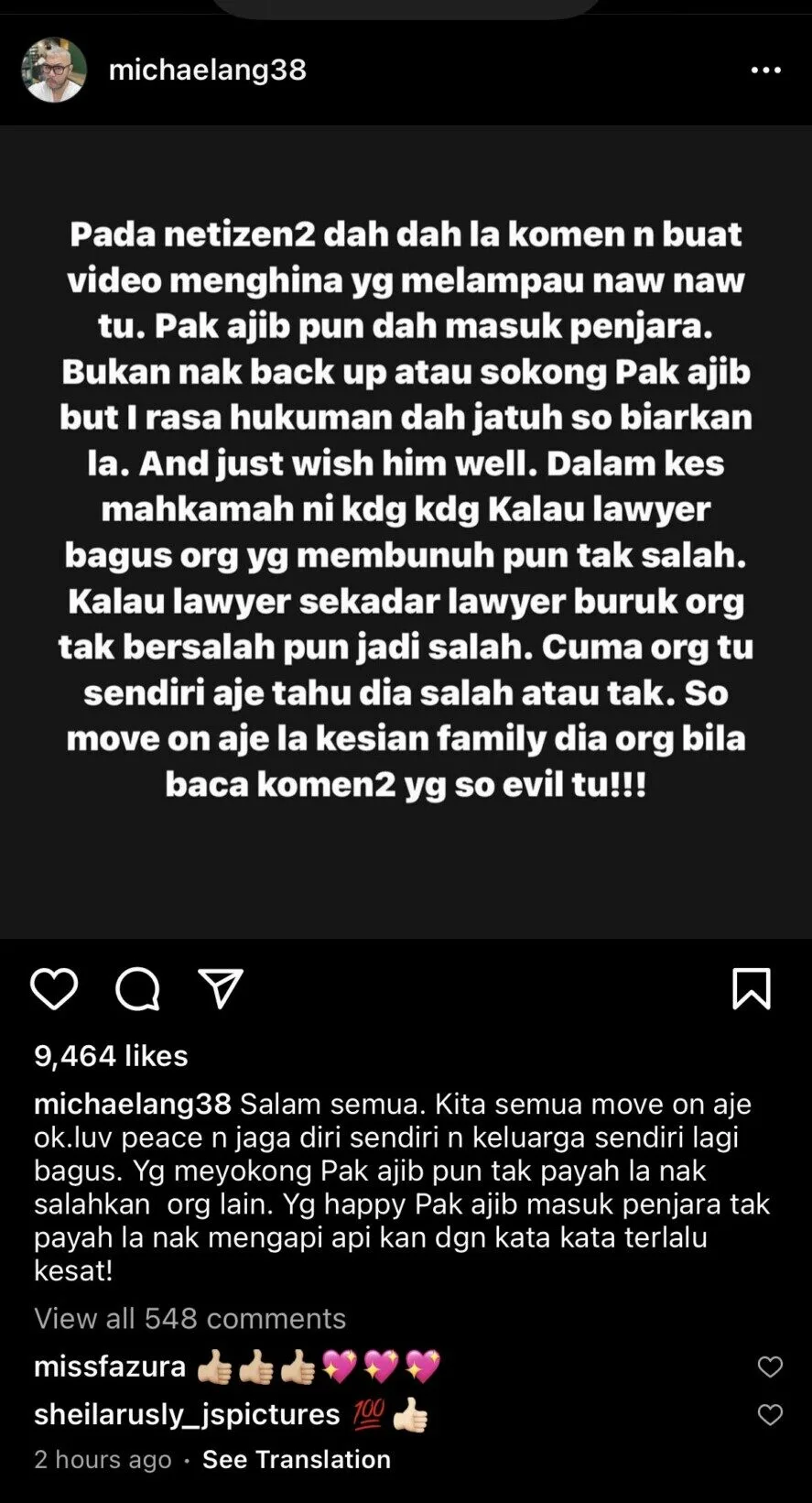 To date, Michael’s post has received over 16k likes, and was flooded with over 1k comments on Instagram. Among those who were spotted leaving their replies include Sheila Rusly, Lizza Abdullah, and also Nur Fazura. The latter responded by leaving thumbs and hearts emojis on the post.