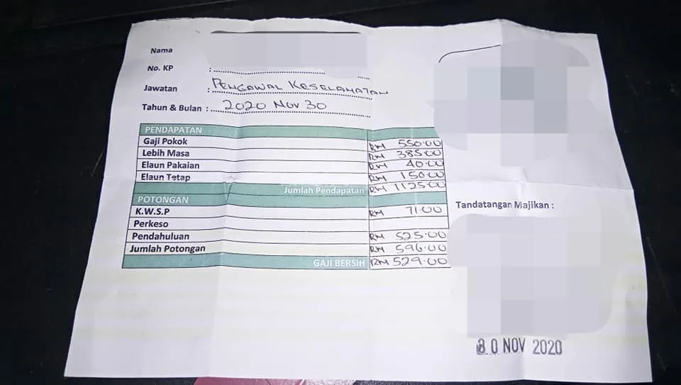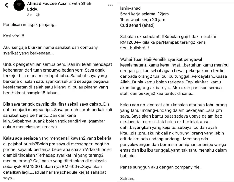 The netizen named Ahmad Fauzee Aziz remarked, “I was a bit shocked when I found out about my friend who works as a security guard in a security company at one of a factory in Penang for almost 15 years.”