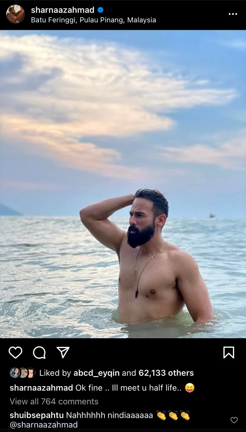 Sharnaaz captioned his post, “Okay fine. I’ll meet you half life (way).” As seen in the location tagged by the actor on the post, apparently he had left for a staycation trip to Batu Feringgi in Penang. At the time of writing, the posting has received over 58k likes from his followers.