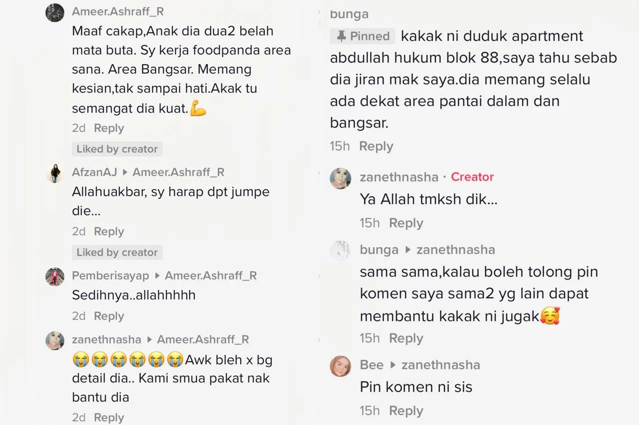 There were two users who explained the situation of the rider, and at the same time shared her location to make it easy for those who would like to lend a helping hand. A user that goes by the name of Bunga, shared that the rider is her mother’s neighbour, living in the Abdullah Hukum’s Apartment block 88 and that she is often around Pantai Dalam and Bangsar. While another user who is also a rider mentioned how the child that she brings along on jobs, is fully blind.