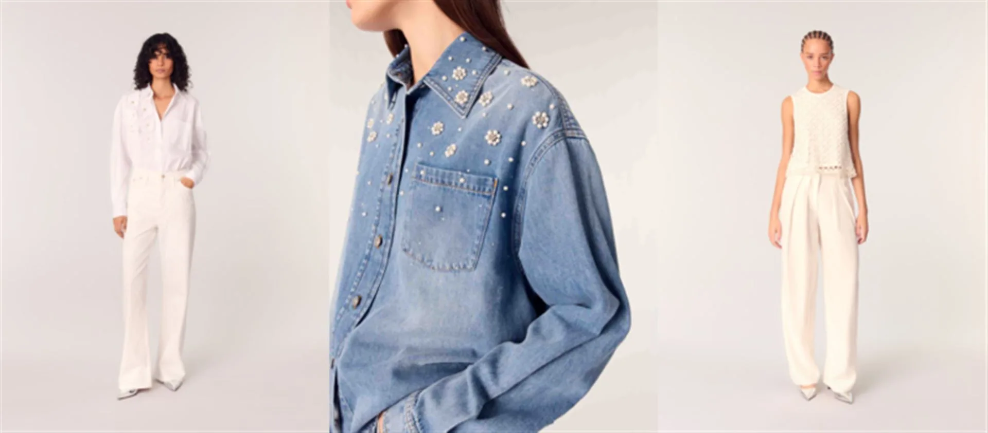 Fresh, effortless, and endlessly chic – Maje’s latest collection proves that denim and white are a match made in fashion heaven. From crisp tailored suits and pleated trousers to delicate cut-out bodysuits and pearl-adorned denim jackets, these pieces bring an elevated touch to everyday dressing.
