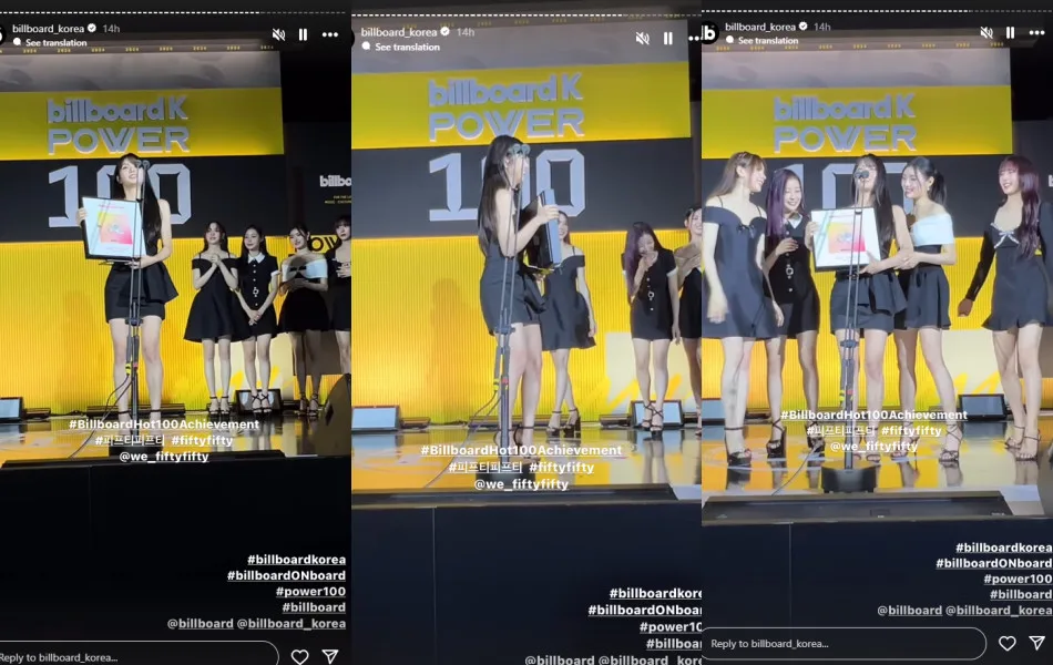 Earlier this week, FIFTY FIFTY was presented with the “Hot 100 Achievement” award for the song “Cupid” at the Billboard K-POWER 100. Members Keena (키나), Chanelle Moon (문샤넬), Yewon (예원), Hana (하나), and Athena (아테나) attended the ceremony but Keena was the one who accepted the award on behalf of the group while the other girls stood behind her. The idols then posed for a photo together.