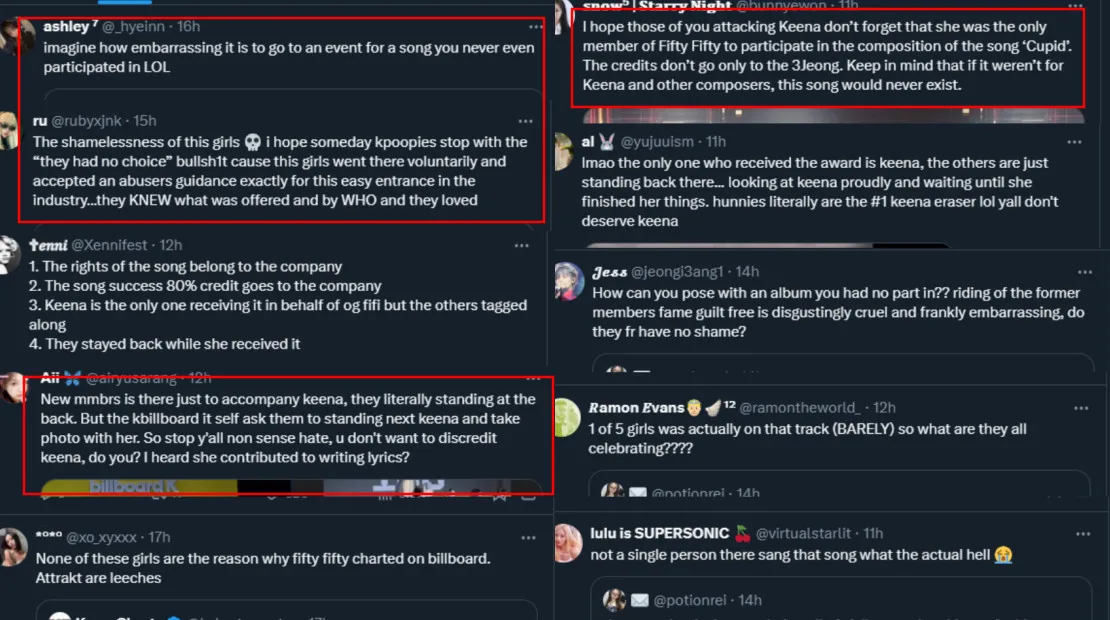 The photo has since gone viral but the responses were not all congratulatory. Many thought it was unfair for the group to accept the award since none of the members actually sang the song including Keena, who is the only original member. Some called the girls shameless for accepting the award despite having no contribution to its success. Of course, FIFTY FIFTY fans came to the group’s defence saying that Keena, while having little to no lines in the song, was one of the credited composers.