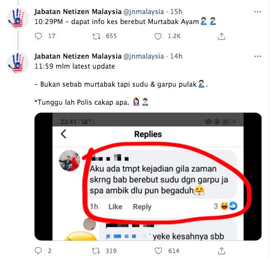 Soon after the clip made its way online, many local netizens started claiming that the duo were quarrelling over chicken murtabak sold at the outlet. A few hours after that, the Twitter user posted another update, saying that the brawl allegedly broke out after the duo were fighting over the mamak stall’s forks and spoons!