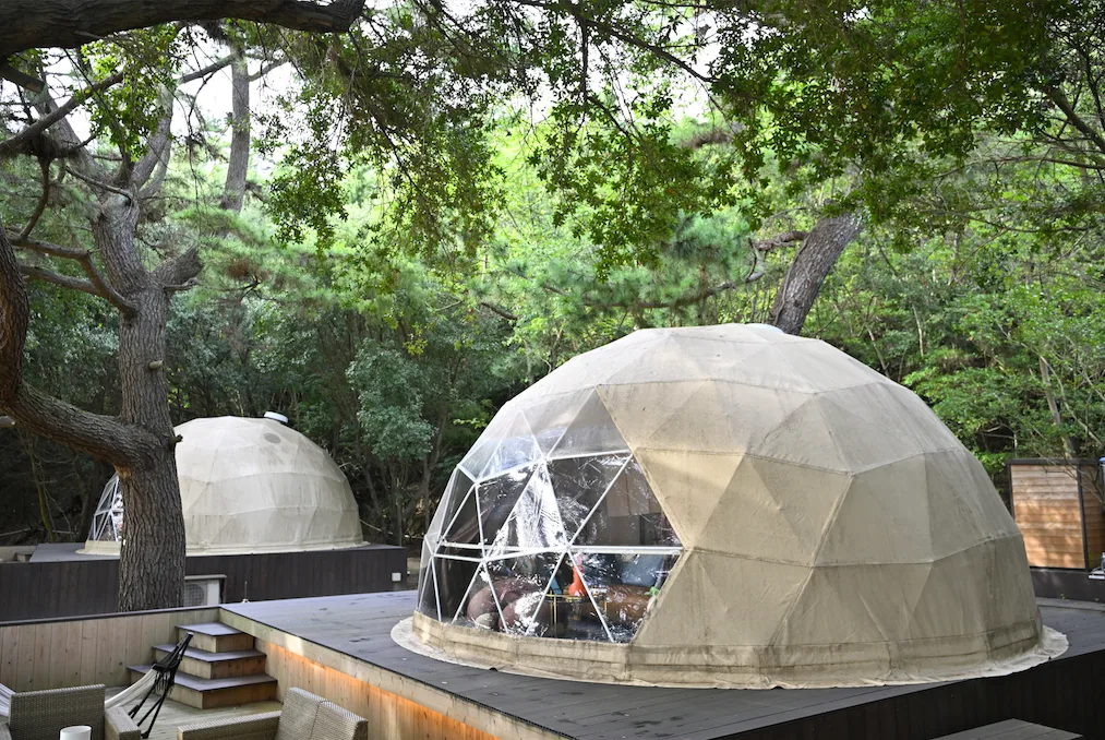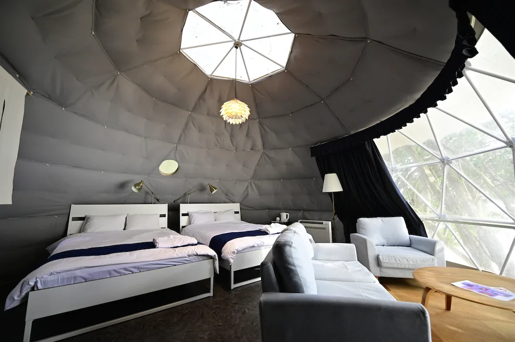 Travelers who opt for glamping (or glamorous camping) at the dome tent lodging have the pleasures of outdoor recreation in a lush natural setting while enjoying the amenities and convenience of a hotel.