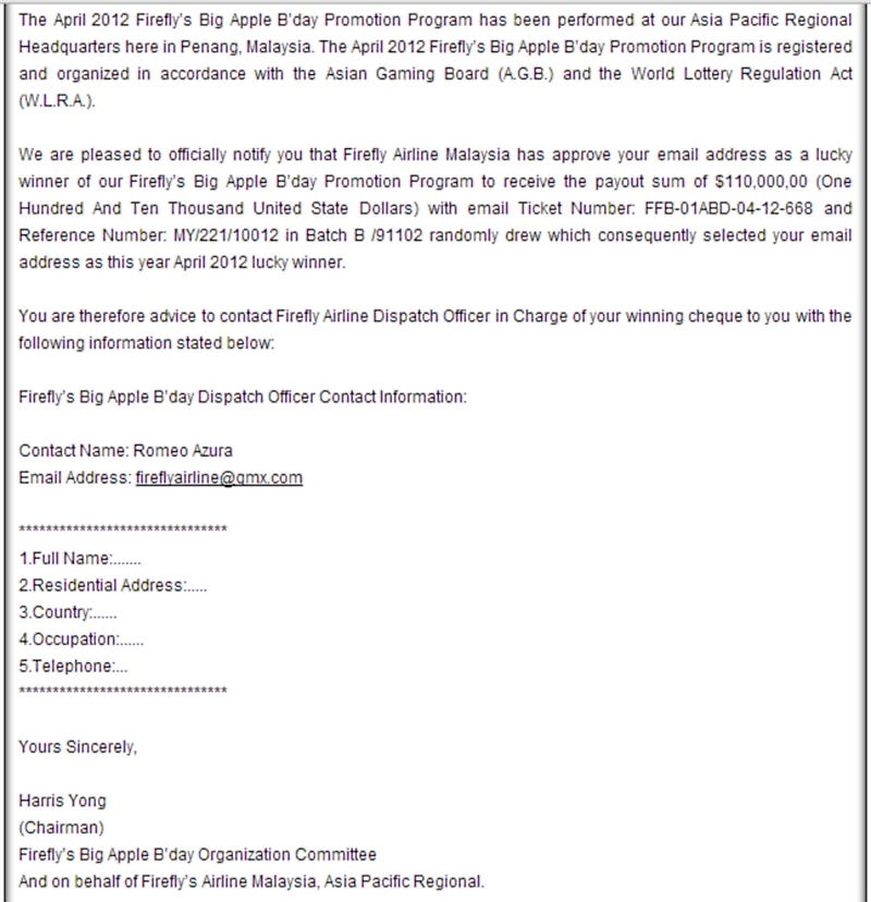 This is, however, not the first time that such scam has surfaced. In April last year, a similar e-mail was circulating claiming that a Firefly Big Apple B’day Promotion Program was “performed” at their Asia Pacific Regional Headquarters and that they’ve picked “a lucky winner” of their program to receive USD110,000,00. To make the scam more “believable”, they’ve even fabricated ticket and reference numbers. In return, the e-mail required the recipient to reply them with personal details to claim the prize: