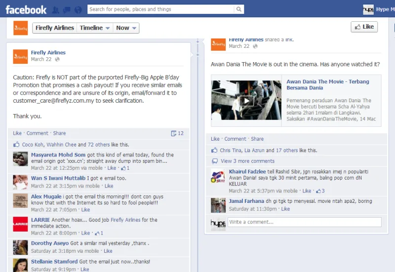 Firefly first sent out the alert via their Facebook page, warning customers and urging them to contact their customer care if unsure of the origins of such e-mails: