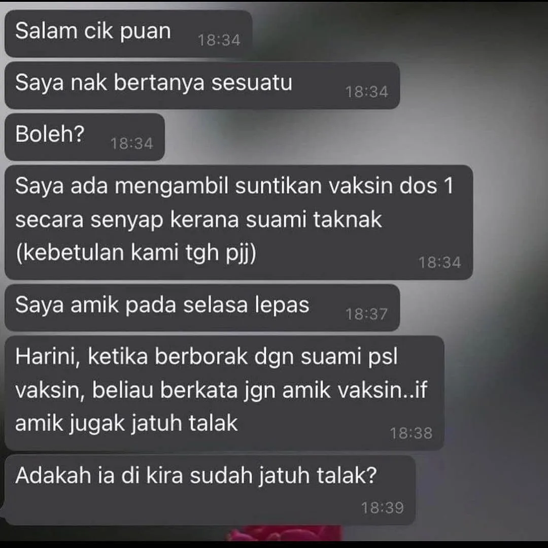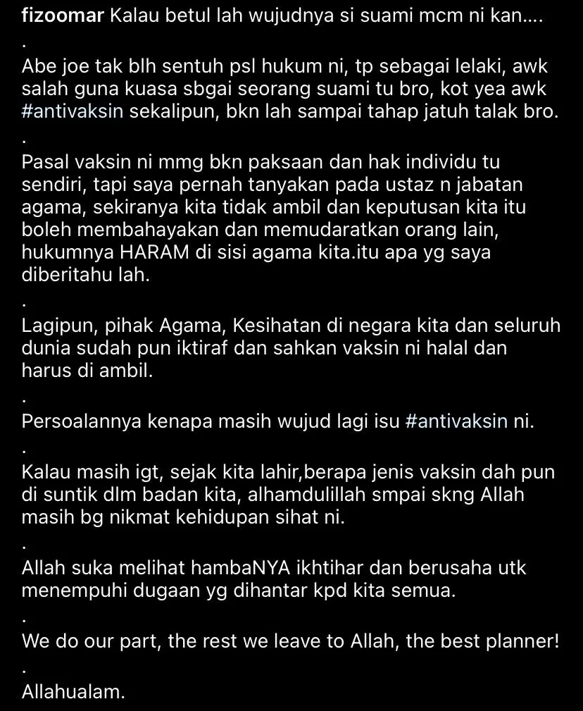 It’s understood that the woman had quietly taken the vaccine, and proceeded to ask for a religious scholar’s opinions on her status as a wife after her hubs decided to divorce her. In sharing his two cents about the issue, Fizo (full name Wan Hafizol Wan Omar) appeared to condemn the actions made by the woman’s husband and feels that the man had abused his status as the man in the family.