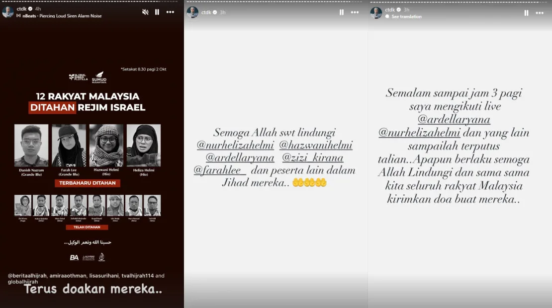 Biduanita Negara Dato’ Sri Siti Nurhaliza has been keeping fans updated through her Instagram Stories about the Flotilla mission. She called on everyone to pray for the volunteers, as well as for her friends who had been abducted. “I’ve been tuning in to their livestreams until 3am, right up until they were cut off. May Allah protect them, and let us all, Malaysians, pray for everyone’s safety,” she wrote.