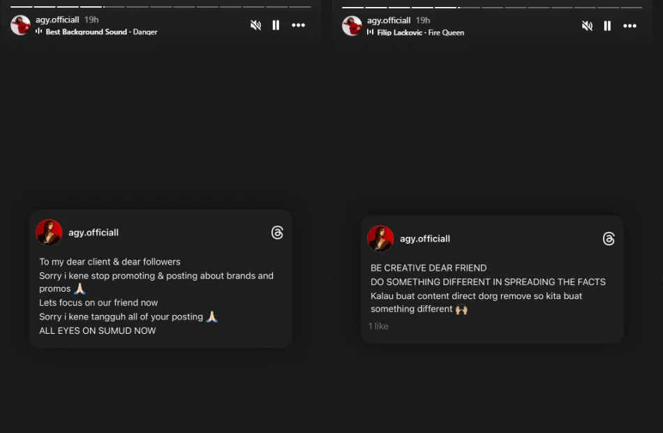 Singer Atilia Haron reposted the Flotilla livestream on her Instagram page, which showed the moment one of the ships was surrounded by the Israeli navy. “When kindness is called a crime, silence is no longer an option. May compassion never be mistaken for danger. May peace one day be stronger than sorrow,” she wrote in her caption.