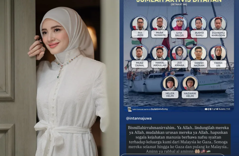 Actress Intan Najuwa posted an update on the number of Malaysians detained during the Flotilla mission. In her caption, she wrote: “This is not because of FOMO, nor for validation from anyone. I am posting because my heart truly wants to. Ya Allah, strengthen them, protect them, and never leave them unattended. Surround them with Your mercy, guard every step they take, and ease every hardship they face.”