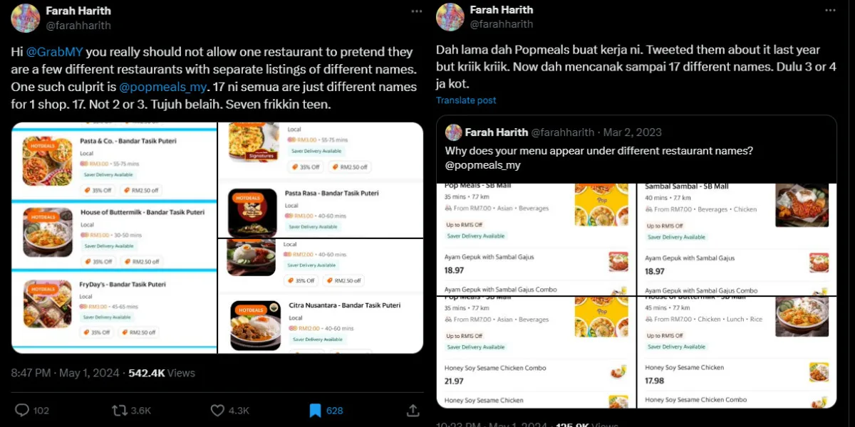 Food delivery apps have revolutionised the way we dine in this age, offering us access to a plethora of culinary options instantly. Yet, lurking beneath the surface of this seemingly simple concept lies a practice that could potentially stir trouble. Yesterday (Wednesday, 1st May 2024), a Twitter user under the handle @/farahharith took to Twitter when she noticed a restaurant using different names with the same menu on the GrabFood app.