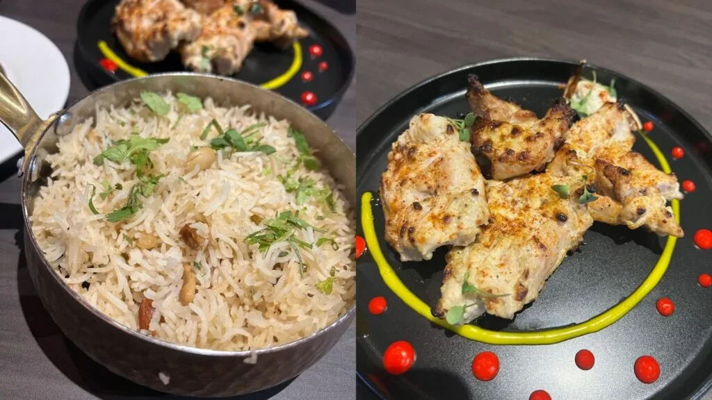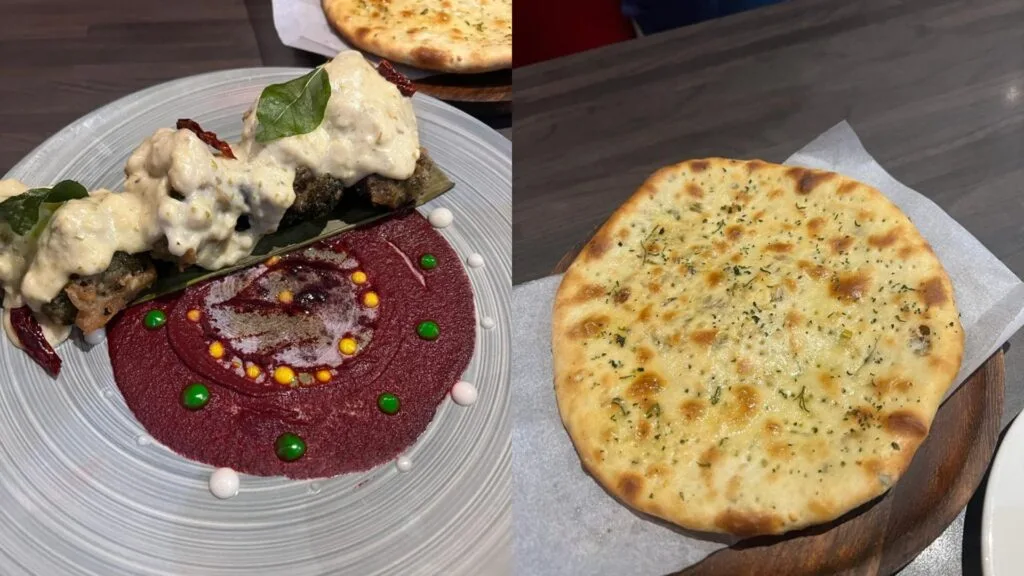 This basically looks and tastes like the Indian version of roast chicken. To prepare this dish, they soak cashew nuts overnight and infused with hang yogurt and spices. They coat the chicken with the batter and slow cook it in a tandoor. Often, when we eat tandoori chicken, it seems dry – but this dish is so different. There’s a strong flavour of tandoori, along with other spices, but the chicken is super moist, making it easy for us to eat it. We definitely loved this dish.