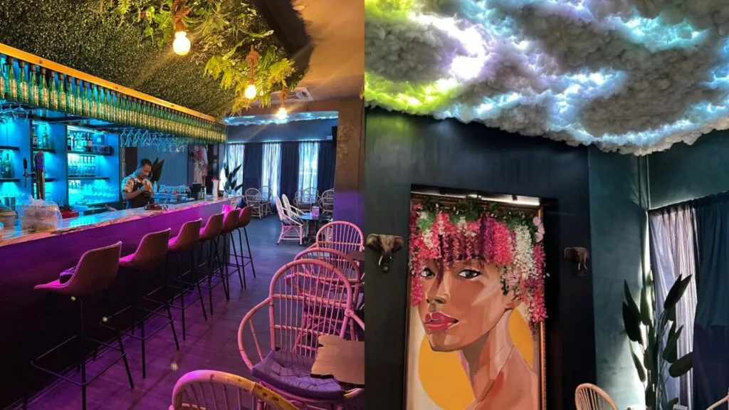The most surprising part to the layout is that there’s a secret entrance to a speakeasy in a nearby room. Just push the portrait and you’ll be transported to this cool and vibrant bar area. Our favourite part of the bar is the ceiling, which is covered with cloud-like cotton balls and LED lights.