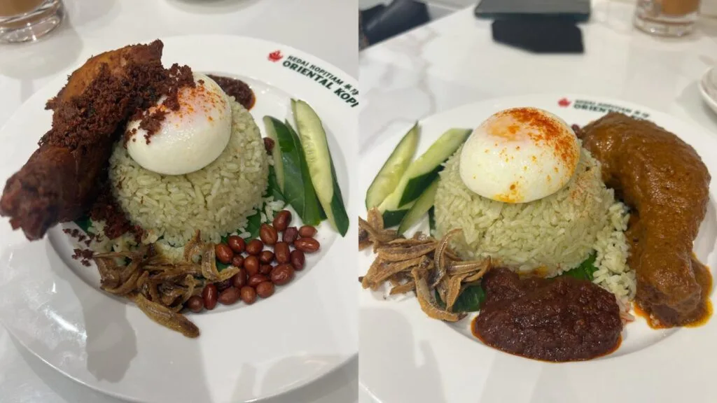 Oriental Kopi has a variety of nasi lemak dishes, and we tried the Oriental Signature Nasi Lemak first. This version is absolutely exceptional, because it includes fragrant pandan steamed rice that has been infused with eight different types of spices, a perfectly cooked sunny side up Oriental egg, crispy fried chicken, peanuts, anchovies, and the finest homemade sambal.