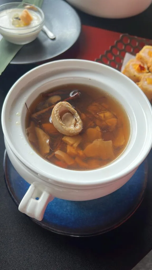 The Fish-shaped Prawn Dumpling was next. This was really cute and smokey (dry ice effect, of course!). Taste-wise, it was just beautiful and juicy. We liked how it was soft and silky on the outside, but crunchy and juicy on the inside. We also tried the Monk Jumped Over The Wall – a weird name, but definitely a huge bao, which is filled with braised south African abalone.