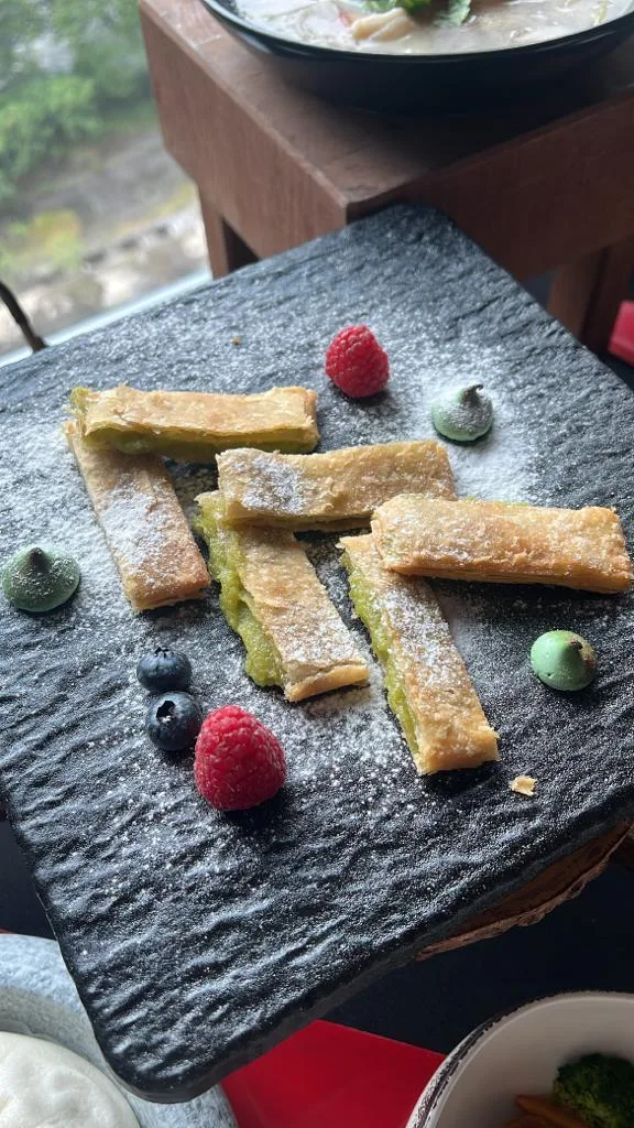 Ah, you know we always have room for dessert. And YEN prepared three different, but unique, desserts for us to try. The first was the Snowflake Chinese Pancake filled with Avocado paste. Okay, we’re definitely not veggie peeps, but this dessert was so good that’ll you’ll be amazed that avocado could taste so good! The pastry skin is flaky and crispy, and is sprinkled with silky, fluffy icing sugar. The best way we can describe it is that it’s like a crispy, deep-fried pancake with avocado paste that tastes like pandan kaya. No joke!