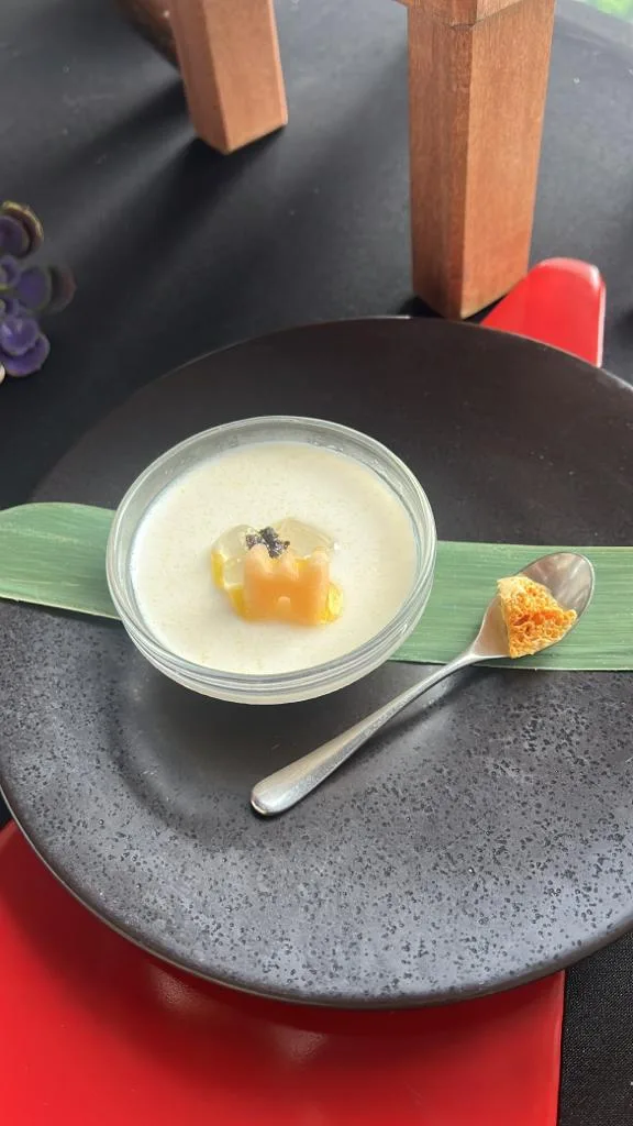 Next up, we had the Milk Pudding with hints of truffles, chilled Aloe Vera, and tiny pieces of honeycomb on the side. This pudding looked unassuming, but the taste was just amazing. After a rich meal, this is the kind of dessert you’d want. It’s super milky, but has the right amount of sweetness. The honeycomb was really sweet, but so was the pudding. We also loved the presentation – the pudding was served on a black plate, with a swerve of banana leaf. The chilled Aloe Vera added a refreshing, crunchy texture to the pudding. It’s our first time trying Aloe Vera, and it was a good combination for the pudding.