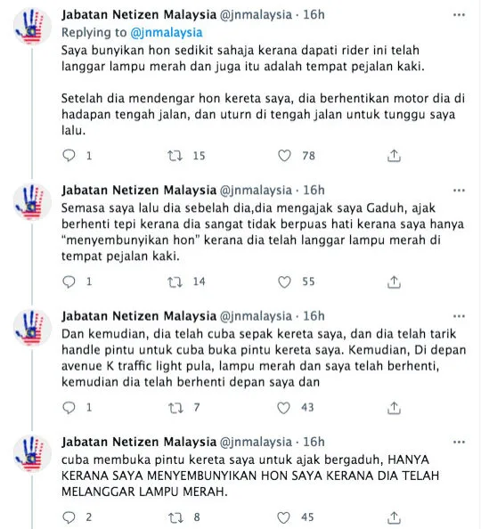 “I honked the horn just a bit, due to the fact that the rider had violated the red light and that it was also a spot for pedestrians. After hearing my car horn, he stopped his motorcycle and made a U-turn in the middle of the road and waited for me,” the driver shared, as posted by the Twitter page Jabatan Netizen Malaysia.