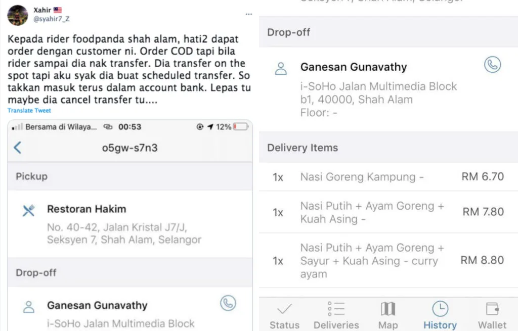 This week, a FoodPanda deliveryman took to his Twitter, @syahir&_Z, to warn his fellow colleagues about this particular customer, known as Ganesan Gunavathy, whom he claimed had manipulated him and ran away with his money.
