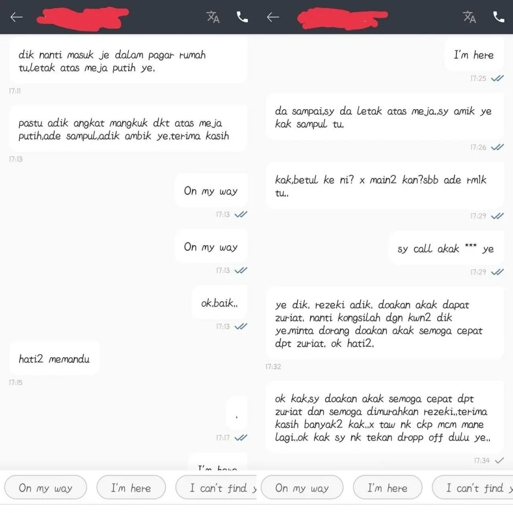 Based on the screen capture of the conversation shared by the delivery man, the woman had asked him to take the envelope that was placed on a white table. When he arrived at the house, Faris then informed her that he had already placed the food she ordered as requested.