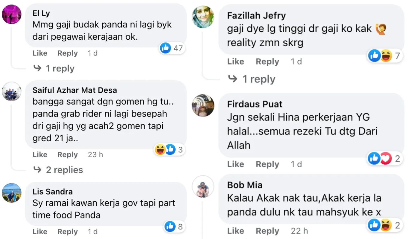Netizens comments can be read such as, “Don’t look down upon others’ professions”, “Foodpanda riders earn more than civil servants”, and also, “If you want to know, you try working as a Foodpanda rider, then you will know how much they make”.